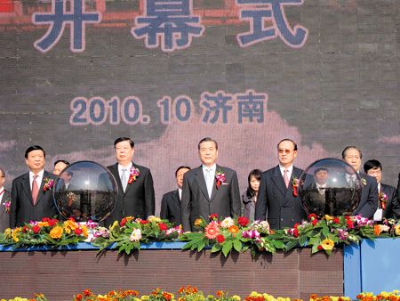“2010年山東臺灣名品博覽會”昨日在山東濟(jì)南展開,山東省委書記姜異康(左二)和臺灣外貿(mào)協(xié)會董事長王志剛(右三)共同出席開幕典禮。圖片來源:臺灣中國時報