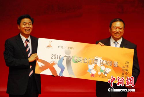 8月17日,“臺灣·廣東周”開幕式在臺北國際會議中心舉行,廣東省省長黃華華率領一個千人大型經貿文化代表團出席。圖為開幕式上黃華華省長代表亞組委向臺灣贈送一萬張亞運門票。中新社發 梁永強 攝