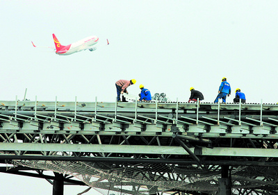 黃花機(jī)場新航站樓建設(shè)工地現(xiàn)場,施工人員正在鋼架上安裝頂板。上半年長沙重大項(xiàng)目建設(shè)投資保持快速增長。