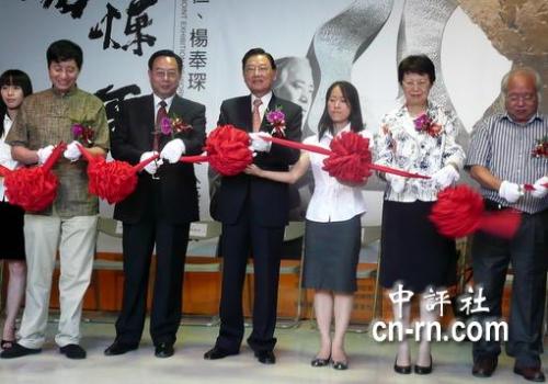 江炳坤(右四)、葉明(左三)及馮明珠(左二)一起為朱炳仁、楊奉琛兩岸雙人藝術(shù)展剪彩。(圖片來(lái)源:香港中評(píng)社 倪鴻祥 攝)