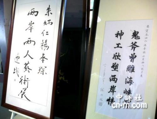 國(guó)民黨榮譽(yù)主席連戰(zhàn)、海協(xié)會(huì)長(zhǎng)陳云林都為這次兩岸雙人藝術(shù)展題詞。(圖片來(lái)源:香港中評(píng)社 倪鴻祥 攝)