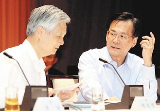 臺灣電力公司昨日舉行股東會,董事長黃重球(右)擔(dān)任主席,主持任內(nèi)首次的股東會,并在會前與總經(jīng)理李漢申(左)交換意見。