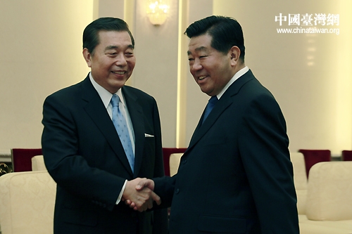 中共中央政治局常委、全國政協主席賈慶林與臺灣世貿中心董事長王志剛親切握手。(中國臺灣網 陳佳慧 攝)