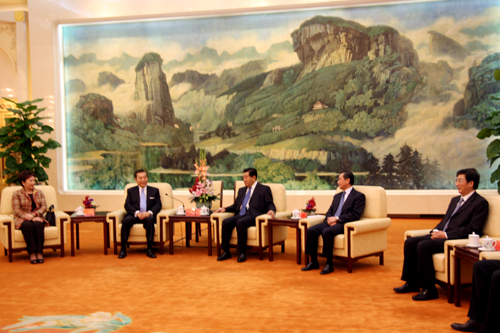 中共中央政治局常委、全國政協主席賈慶林在人民大會堂福建廳會見來京參加第十四屆京臺科技論壇的臺灣工商界代表。(中國臺灣網 張曉靜 攝)