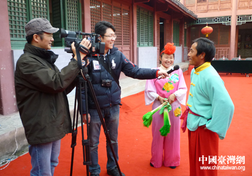 臺灣記者在蚌埠采訪表演花鼓燈的農(nóng)民。(安徽省臺辦 裔淳 攝)