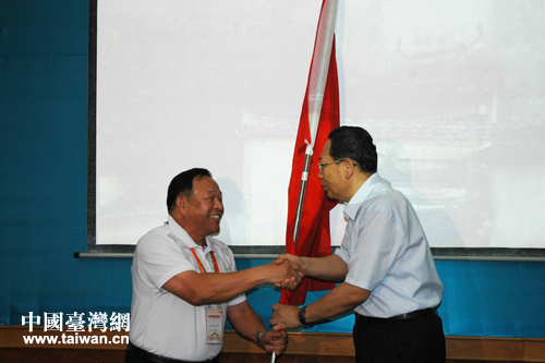 安徽省委副書記李錦斌向夏令營臺(tái)灣領(lǐng)隊(duì)老師授旗。(安徽省臺(tái)辦 裔淳 攝)
