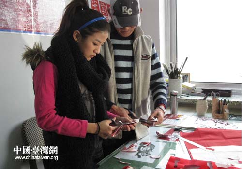黃老現場教臺灣中天電視臺主持人幃幃學習滿族剪紙(圖片來源:撫順市臺辦)