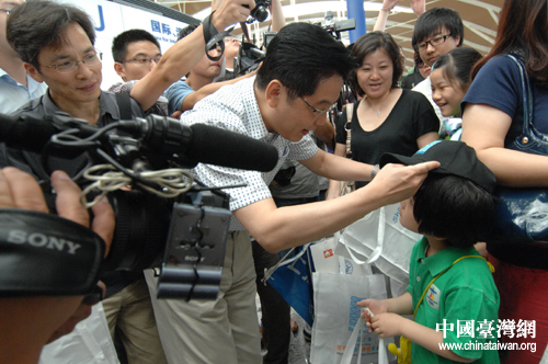 上海臺辦副主任顧洪輝向小游客贈送紀念品(圖片來源:上海市臺辦)