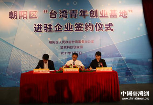北京市朝陽區(qū)“臺(tái)灣青年創(chuàng)業(yè)基地”首批進(jìn)駐企業(yè)簽約儀式現(xiàn)場(圖片來源:北京市朝陽區(qū)臺(tái)辦)