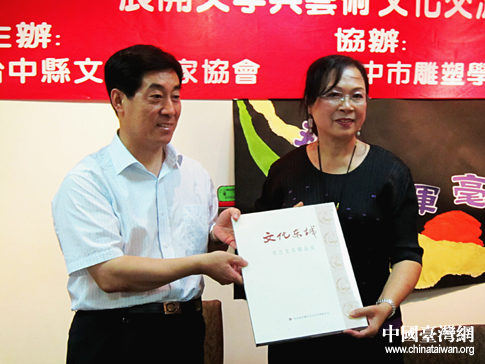 向臺(tái)中縣文藝作家協(xié)會(huì)理事長(zhǎng)林美怡贈(zèng)送《文化東城——書(shū)法美術(shù)精品集》(圖片來(lái)源:北京市臺(tái)辦)