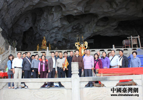 陳福林一行與臺灣游客在乾元山金光洞前合影留念。(圖片來源:綿陽市臺辦)