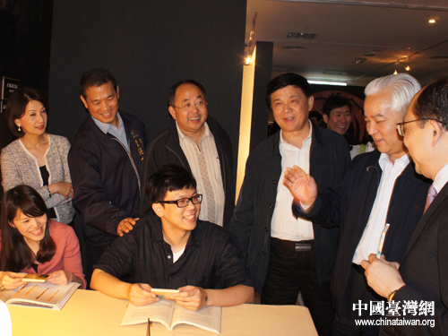 四川省政協(xié)主席陶武先與正在展場參觀的臺(tái)灣青年觀眾交流。(圖片來源:四川省臺(tái)辦)