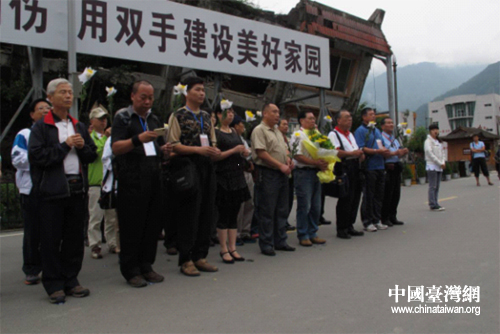 參訪團一行在北川老縣城悼念遇難同胞。(圖片來源:四川省臺辦)