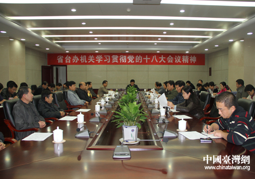 省臺辦機(jī)關(guān)學(xué)習(xí)貫徹黨的十八大會議精神。(圖片來源:陜西省臺辦)