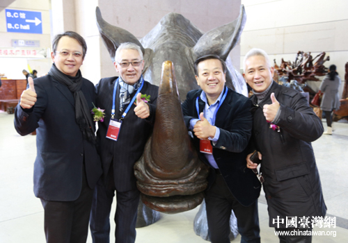 嘉賓們在威海文博會現場銅制犀牛前合影。(威海市臺辦 王建利 攝)