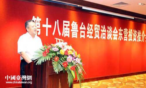 李俊峰副市長(zhǎng)在第十八屆魯臺(tái)經(jīng)貿(mào)洽談會(huì)推介東營(yíng)。(圖片來(lái)源:東營(yíng)市臺(tái)辦)