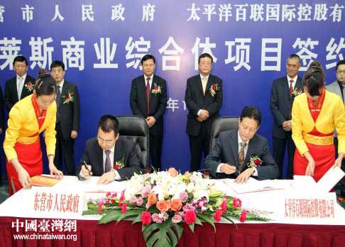 東營(yíng)市人民政府、太平洋百聯(lián)國(guó)際控股有限公司奧特萊斯商業(yè)綜合體項(xiàng)目簽約儀式。(圖片來(lái)源:東營(yíng)市臺(tái)辦)