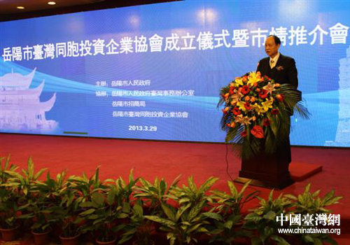 中國臺灣網(wǎng)4月3日岳陽消息 日前,由岳陽市人民政府主辦,市臺辦、市招商局、市臺協(xié)共同承辦的岳陽市臺灣同胞投資企業(yè)協(xié)會成立儀式暨市情推介會在煙波浩淼的洞庭湖畔,氣勢雄偉的岳陽樓下,風(fēng)景秀美的南湖之濱隆重舉行。臺灣;鶗麻L林中森一行,全國臺企聯(lián)總會長郭山輝、常務(wù)副會長兼秘書長何世忠,國臺辦綜合局副局長、海協(xié)會副秘書長鄭崇陽,省臺辦主任馮波,各地臺協(xié)會長和重要臺商聚集岳陽。