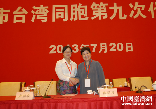 上海市臺聯八屆理事會會長林明月(右)與市臺聯九屆理事會新當選會長盧麗安。(上海市臺聯 王茜 攝)