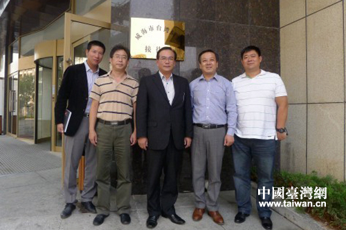 威海市臺辦主任于連波(右二)與臺灣中華航空公司王博榮(中)在威海市臺灣同胞接待站前合影。(威海市臺辦供圖)