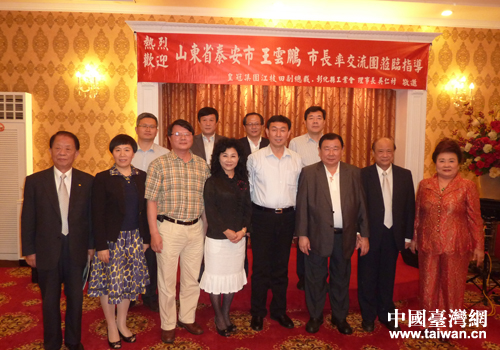 中國臺灣網11月7日泰安消息 日前,赴臺參加“2013臺灣·山東周”活動的泰安市經濟文化交流團來到臺中,與臺灣皇冠集團、彰化縣工業會共同舉辦了泰臺經濟界人士懇談會。由市委副書記、市長王云鵬率領的交流團全體成員以及中國國民黨中央評議委員羅本昌、彰化縣副縣長林田富、大漢技術學院董事長廖繼成、臺灣皇冠集團副總裁江枝田、彰化縣工業會理事長吳仁村、寶成集團事業部總經龔松煙等60多位臺中、彰化的政商界知名人士參加活動。