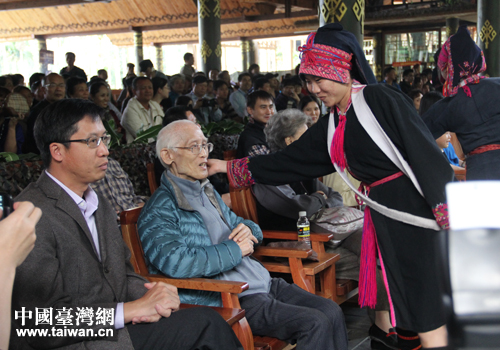 參加表演的黎族少女把“捏耳朵”禮節(jié)送給余光中先生。(中國臺灣網(wǎng) 李瑞艷 攝)