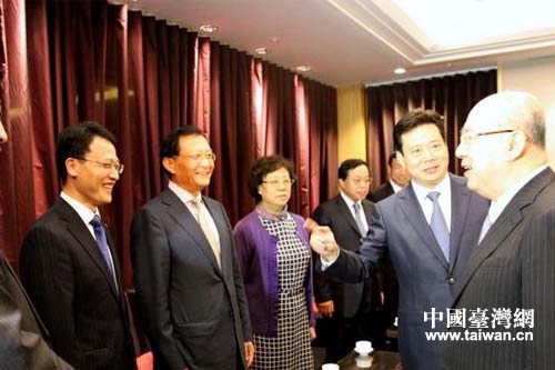青島市委李群書(shū)記在臺(tái)北向吳伯雄榮譽(yù)主席介紹青島團(tuán)中的企業(yè)家。(圖片來(lái)源:山東省臺(tái)辦)