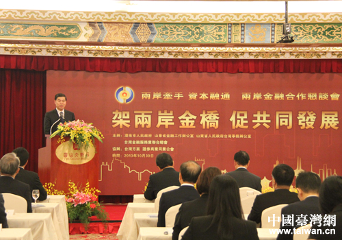 楊魯豫市長在兩岸金融合作懇談會上致辭推介濟南。(圖片來源:濟南市臺辦)