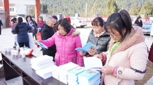 長壽村村民翻閱惠農政策、農業(yè)科普宣傳資料