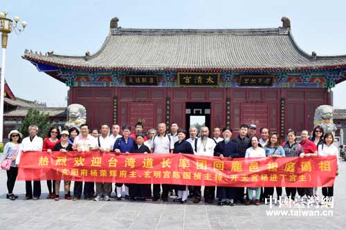 中國臺灣網5月12日鹿邑消息 日前,臺灣“我愛中華”文化參訪團一行24人在楊辰威道長、玄陽府府主楊榮輝、玄明宮主持陳國楨和開天宮宮主楊進丁帶領下蒞臨道教祖庭河南鹿邑縣朝圣拜祖,中共鹿邑縣委辦副主任、旅游局局長丁震表示歡迎。