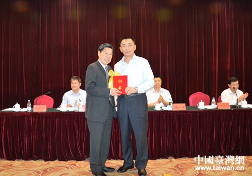 市臺辦李兆兵主任代表主管部門向王金銷會長頒發協會印鑒和任職證書。(圖片來源:濟南市臺辦)