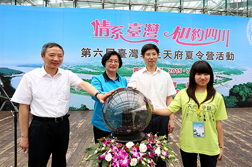 四川省臺(tái)辦主任周敏謙(左一)、省教育廳廳長(zhǎng)朱世宏(右二)、臺(tái)灣民意代表王惠美(左二)及臺(tái)灣學(xué)生代表(右一)共同按動(dòng)夏令營(yíng)啟動(dòng)球。(圖片來(lái)源:四川省臺(tái)辦)