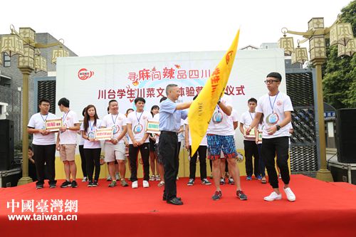 7月20日,“尋麻問辣品四川”川臺學生川菜文化體驗營拉開帷幕,圖為四川省臺辦主任周敏謙授營旗。(圖片來源:四川省臺辦)