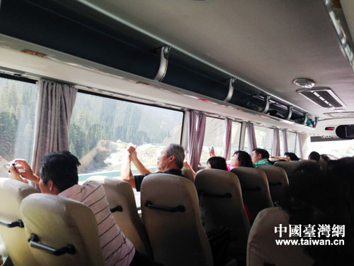 團(tuán)員們?cè)谲嚿涎赝九臄z果子溝大橋。(中國臺(tái)灣網(wǎng) 馬一娜 攝)