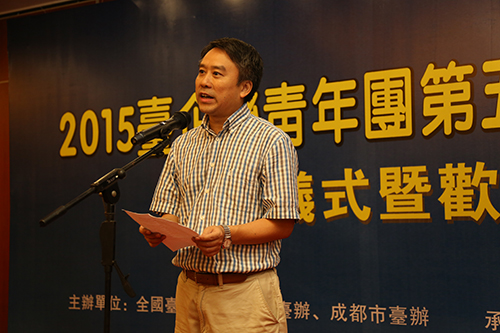 成都市臺辦主任戴浚在2015全國臺企聯(lián)青年團四川研習營開營儀式上致歡迎辭。(圖片來源:四川省臺辦)
