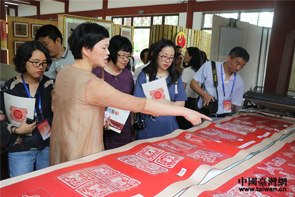 兩岸媒體走進鄂州民間工藝美術(shù)館,參觀雕花剪紙、麥稈畫等民間工藝品,了解鄂州市傳統(tǒng)文化。(中國臺灣網(wǎng) 郜利敏 攝)