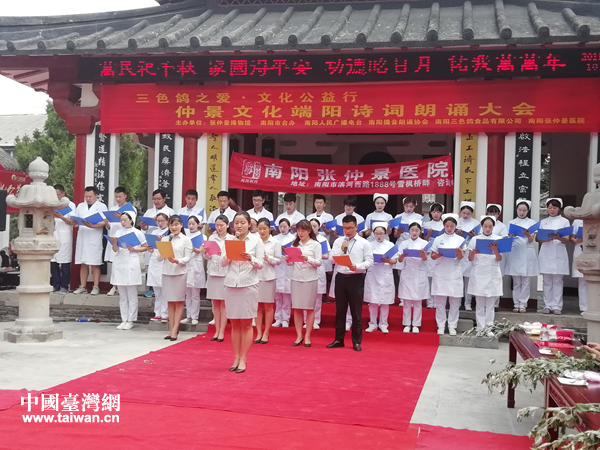 中國(guó)臺(tái)灣網(wǎng)6月19日南陽(yáng)訊 6月14日,仲景文化端陽(yáng)詩(shī)詞朗誦大會(huì)在河南省南陽(yáng)市醫(yī)圣祠舉辦,南陽(yáng)市臺(tái)辦、南陽(yáng)市臺(tái)商界、南陽(yáng)博物館界、播音朗誦界、書(shū)畫(huà)界等知名人士和詩(shī)詞朗誦愛(ài)好者共200余人參加了活動(dòng)。