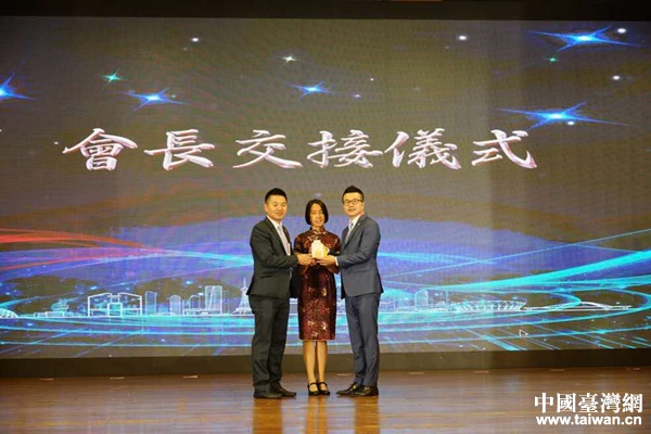 在佛山市委臺辦主任香秀杏(中)的見證下,詹正興(右一)從第二屆會長劉偉立(左一)手中接過會長印鑒。(圖片來源:佛山市臺辦)