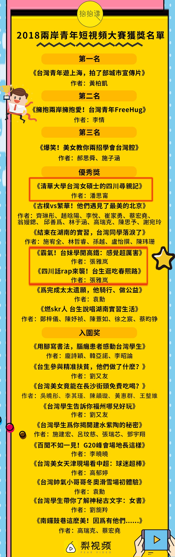 經專業評委評分,綜合網友投票點贊和網絡點擊率、完播率等數據,大賽決出一、二、三等獎各1名,并產生7名優秀作品獎和10名入圍作品獎。其中,3部四川題材作品獲優秀獎,分別是:臺青網紅“肆零”(潘思甯)的作品《清華大學臺灣女碩士的四川尋親記》和臺青網紅“雪梨”(張雅嵐)的作品《霸氣!臺妹學開高鐵:感覺超厲害》、《四川話rap來襲!臺生逛吃春熙路》。
