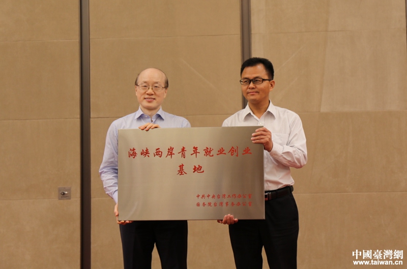 國臺辦主任劉結一向亞臺青海峽青年創業園授牌國家級“海峽兩岸青年創新創業基地”。(圖片來源:四川省臺辦)