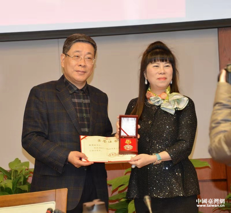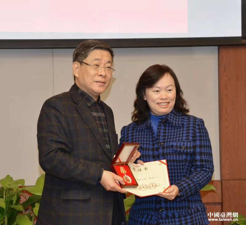 上海市臺辦主任李文輝為獲得2017-2018年度上海市三八紅旗手的臺胞頒發榮譽證書。(圖片來源:上海市臺辦)