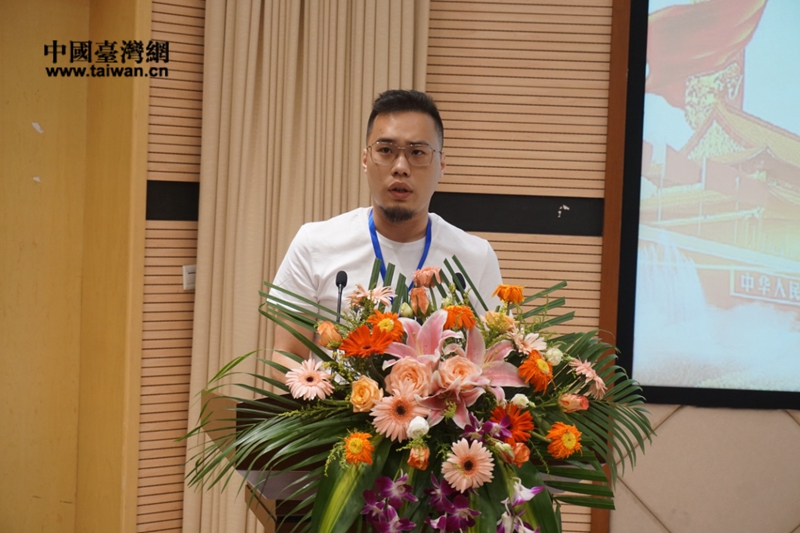 臺灣領(lǐng)隊代表、臺灣高雄中華文化經(jīng)貿(mào)交流發(fā)展協(xié)會總干事許迪代表組團(tuán)方發(fā)言(圖片來源:四川省臺辦)