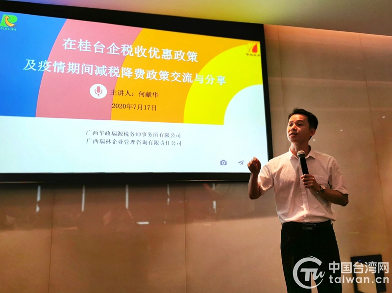 特聘講師何獻華做在桂臺企稅收優惠政策講座輔導。(圖片來源:廣西南寧市臺辦)