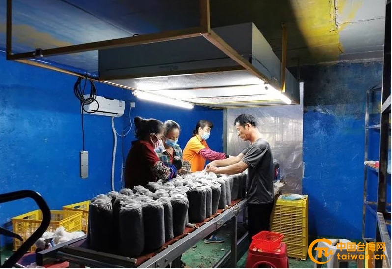 臺資企業廣西八仙菇農業開發有限公司消毒車間內工人把菌種接入到消毒好的菌包內。(廣西來賓市臺辦供圖)