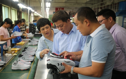 欽州市臺辦考察廣西興萊鞋業生產線。(廣西欽州市臺辦供圖)