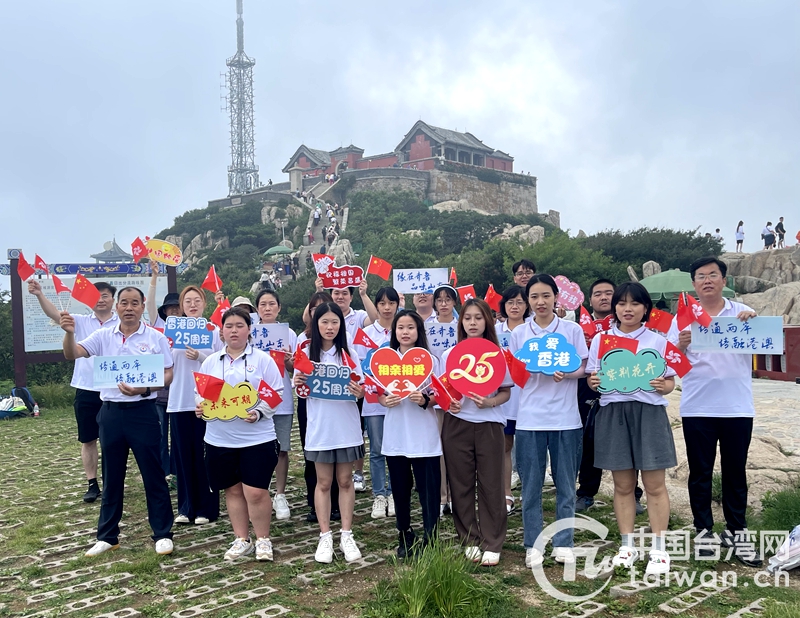 中國臺灣網7月6日訊 “讓海風吹拂了五千年,每一滴淚珠仿佛都說出你的尊嚴;讓海潮伴我來保佑你,請別忘記我永遠不變黃色的臉……”2022年7月1日,香港回歸25周年紀念日!熬壴邶R魯 品味山東”臺港澳青年學生看山東活動的青年學生們來到了五岳之首——泰山,矗立泰山之巔,大家激動地揮動著國旗和香港特區區旗,唱響《東方之珠》這一經典旋律,高聲呼喊“祝福香港、祝福祖國”,共同慶祝香港特別行政區回歸祖國25周年,向祖國母親致敬!
