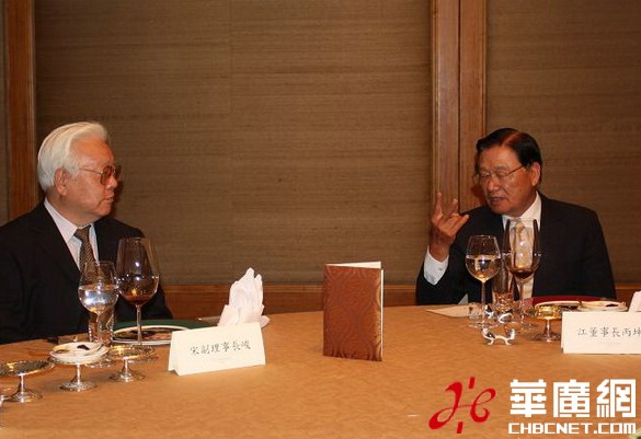 6月23日晚,臺灣海峽交流基金會董事長江丙坤在臺北會見了由福建省文化經濟交流中心副理事長宋峻率領的福建京 劇票友赴臺交流團一行,雙方圍繞進一步宏揚中華文化,共同促進閩臺在京劇等文化領域交流交換了看法。(記者 志剛)