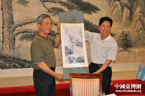 廣東省臺(tái)辦副主任蔣長芳與臺(tái)中市南區(qū)里長聯(lián)誼會(huì)榮譽(yù)團(tuán)長李印欽互贈(zèng)紀(jì)念品。(圖片來源:清遠(yuǎn)市臺(tái)辦)