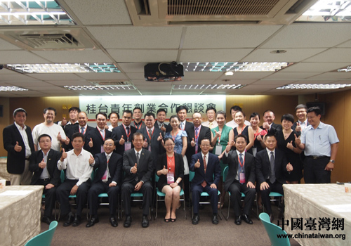 中國(guó)臺(tái)灣網(wǎng)7月24日臺(tái)北消息 7月23日下午,2012年桂臺(tái)經(jīng)貿(mào)文化論壇系列活動(dòng)之“2012桂臺(tái)青年創(chuàng)業(yè)合作懇談會(huì)”在臺(tái)北隆重舉行。該活動(dòng)由廣西青年聯(lián)合會(huì)、臺(tái)灣青年創(chuàng)業(yè)總會(huì)兩岸青年組織聯(lián)合舉辦,圍繞“青春攜手 共創(chuàng)未來(lái)”主題,廣西青聯(lián)代表團(tuán)全體成員及臺(tái)灣青創(chuàng)總會(huì)、臺(tái)北青創(chuàng)會(huì)青年代表共50多人出席了懇談會(huì)。