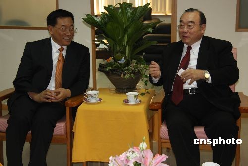 6月7日,中華全國歸國華僑聯(lián)合會主席林軍一行8人組成的訪問團抵達臺北,在臺北重慶南路拜會臺灣華僑救國聯(lián)合總會理事長簡漢生。這是中華全國歸國華僑聯(lián)合會主席首次赴臺訪問。 中新社發(fā) 耿軍 攝